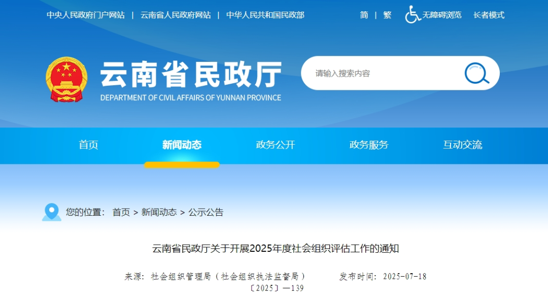 根据民政部《关于推进民间组织评估工作的指导意见》(民发〔2007〕127号)、《社会组织评估管理办法》(民政部令第39号)和《云南省社会组织评估管理办法》(云民规〔2023〕9号)有关规定,为规范有序开展2025年度社会组织评估工作,现将有关事项通知如下: