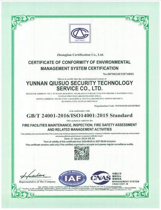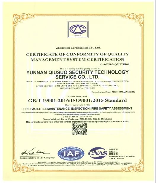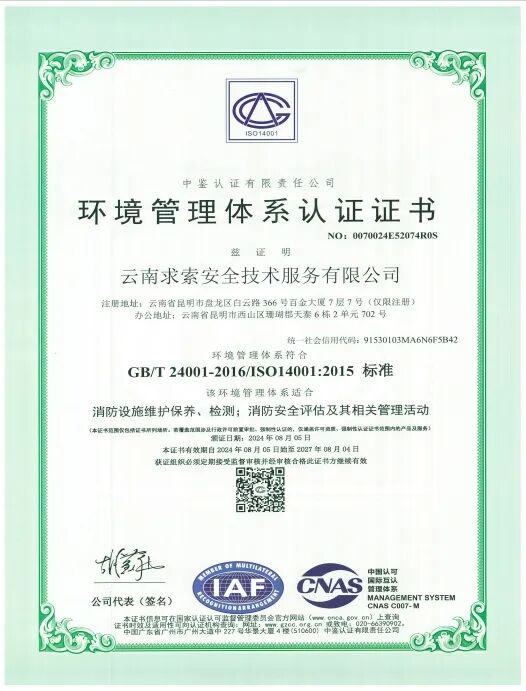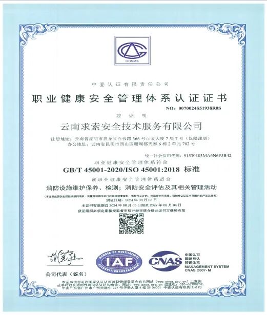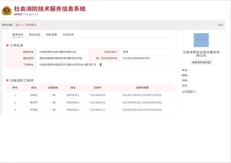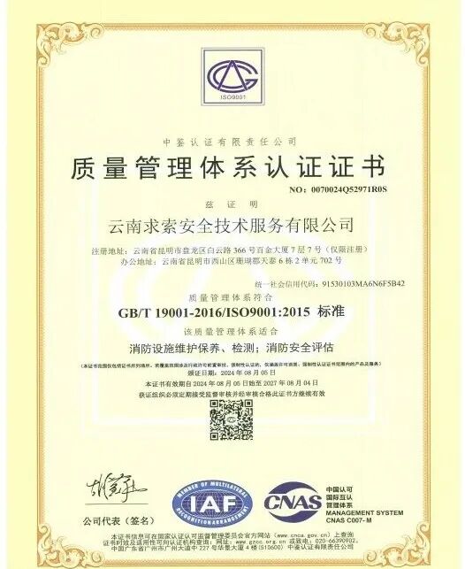 云南求索安全技术服务有限公司成立于2018年5月21日,注册资本200万元,地址:云南省昆明市呈贡区乌龙街道七彩云南第一城双子星1号楼天枢4311号。是一家以消防技术服务为核心、专注于为政府与企业提供全生命周期解决方案的专业机构。公司自创立以来,始终秉持“专业、诚信、求索、共赢”的价值理念,深耕云贵、辐射西南,已累计为数百个重点项目提供高品质服务,履约率与客户满意度双双保持100%,在业内树立起“求索服务”金字口碑。